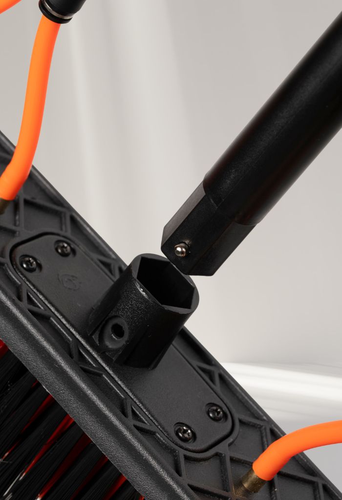 Unieke zeshoekige verbinding voor het spelingvrij en razendsnel wisselen van accessoires.