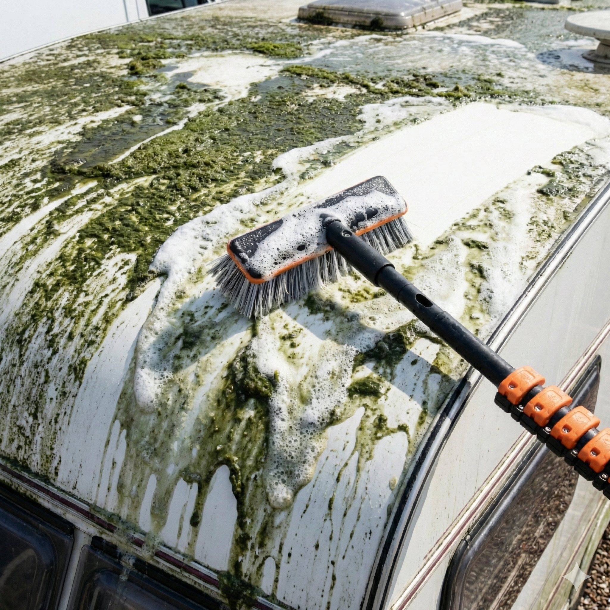 Bei großen Fahrzeugen ist eine besondere Vorgehensweise erforderlich. Das Dach ist ein idealer Nährboden für Grünablagerungen, Harz und Vogelkot, aber es ist schwer zugänglich.